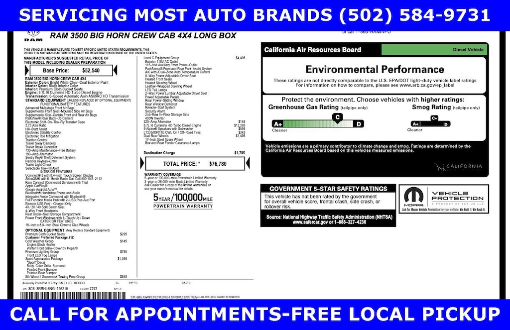 BLUE ADVANTAGE CERTIFIED WARRANTY* 2022 RAM 3500 BIG HORN 4x4 6.7L CUMMINS HIGH OUTPUT TURBO DIESEL (370hp w/850 lb-ft TORQUE 1700 RPMs) DUAL REAR WHEELS w/SPORT APPEARANCE Pkg-5th WHEEL/GOOSENECK TOWING PREP GROUP-Level C Equipment Group-Exterior 115V AC Outlet-115--Volt Auxiliary Front Power Outlet-ParkSense Front and Rear Park Assist System-A/C w/Dual Zone Auto Temperature Control-8 Way Power Adjustable Driver Seat-Heated Front Seats-Heated Steering Wheel-2 Way Power Lumbar Adjustable Driver Seat-Power Adjustable Pedals-Rear Power Sliding Window Rear Window Defroster-Remote Start System-Security Alarm-400W Inverter-220 Amp Alternator-Engine Block Heater. *FORD BLUE ADVANTAGE® BLUE CERTIFIED VEHICLES ARE COVERED BY A FACTORY BACKED LIMITED WARRANTY: -- FOR A FORD, BUICK, CHEVROLET, CHRYSLER, DODGE, GMC, HONDA, JEEP, MAZDA, NISSAN, RAM, SUBARU, OR TOYOTA VEHICLE, 3-MONTH/4,000-MILE COMPREHENSIVE LIMITED WARRANTY BEGINS AT THE EXPIRATION OF THE NEW-VEHICLE LIMITED WARRANTY OR THE SIGNATURE DATE OF THE FORD BLUE ADVANTAGE® -- BLUE CERTIFIED VEHICLE PURCHASE (WHICHEVER COMES LATER) -- FOR OTHER MANUFACTURERS NOT LISTED ABOVE, COMPREHENSIVE COVERAGE IS PROVIDED FOR 3 MONTHS OR 4,000 MILES, WHICHEVER COMES FIRST, FROM THE SIGNATURE DATE OF THE FORD BLUE ADVANTAGE -- BLUE CERTIFIED PURCHASE. -- COMPREHENSIVE LIMITED WARRANTY COVERING 1,000+ COMPONENTS * 14-DAY OR 1,000-MILE MONEY BACK GUARANTEE, WHICHEVER COMES FIRST (SEE MONEY BACK GUARANTEE OPERATIONS GUIDE FOR FULL DETAILS.) * 11,000 FORDPASS® REWARDS POINTS TO USE TOWARD SCHEDULED MAINTENANCE VISITS OR OTHER REWARDS * SIRIUSXM THREE-MONTH COMPLIMENTARY TRIAL * CERTIFIED LIMITED WARRANTY INCLUDES: -- ROADSIDE ASSISTANCE FOR THREE MONTHS -- RENTAL CAR REIMBURSEMENT -- DESTINATION EXPENSE REIMBURSEMENT * VEHICLE ELIGIBILITY REQUIREMENTS ARE: -- CURRENT PLUS NINE PREVIOUS MODEL YEARS -- LESS THAN 150,000 ACTUAL MILES *TO BE CERTIFIED, ALL VEHICLES MUST PASS UP TO A 139-POINT INSPECTION, ENSURING THAT THE VEHICLE IS CLEAN AND MECHANICALLY SOUND (OIL CHANGE, FLUIDS TOPPED OFF, ETC.). PRICE DOES NOT INCLUDE $639.50 PRE/POST DELIVERY PREPARATION ADMIN FEE, DEALER INSTALLED ACCESSORIES IF ANY, STATE AND LOCAL TAXES OR STATE TITLE FEES.