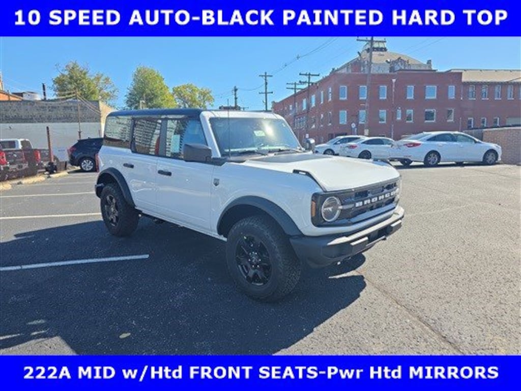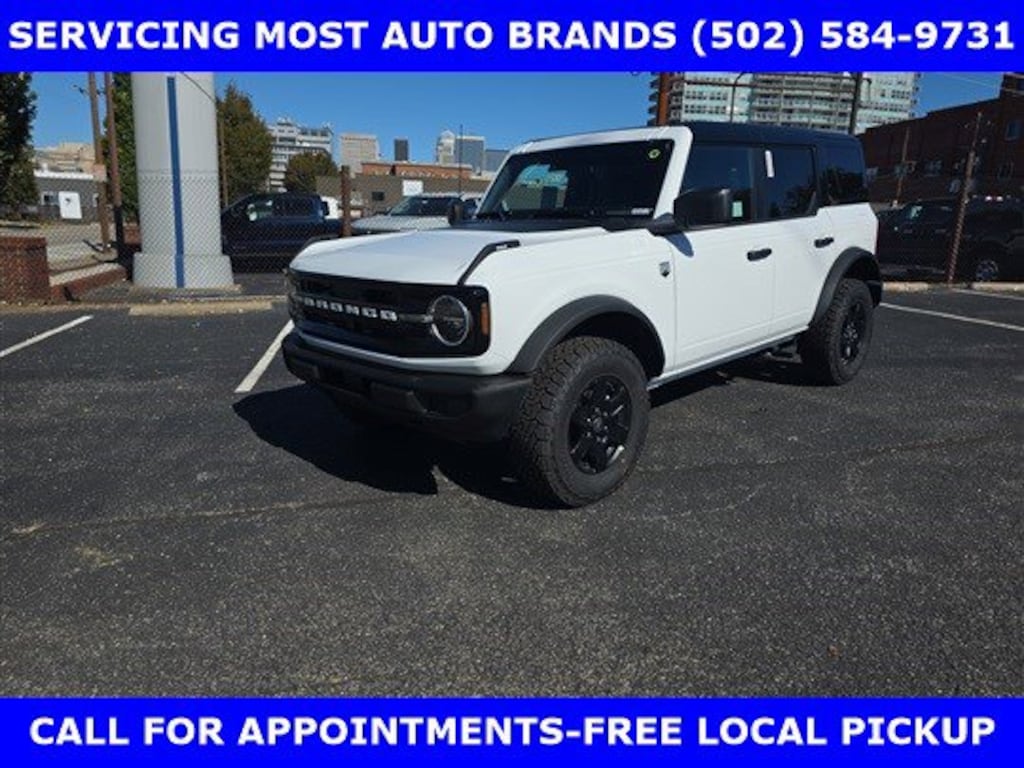 **PRICE INCLUDES $2000 RETAIL BONUS CASH (EXP. JAN 5 2026) + 1000 MEGA BONUS CASH (EXP. JAN 2 2026)** 2025 BIG BEND 4 DOOR 4X4 2.3L ECOBOOST I4 ENGINE (300hp PREM) w/10 SPEED AUTO TRANSMISSION-BLACK APPEARANCE PACKAGE-BLACK PAINTED HARD TOP w/SOUND DEADENING HEADLINER-BLACK APPEARANCE GRAPHIC-17" BLACK GLOSS PAINTED ALUM WHEELS-EQUIPMENT GROUP 222A w/HEATED FRONT SEATS-CONNECTED NAVIGATION-12" TOUCH SCREEN w/REAR VIEW CAMERA-REAR PARKING SENSORS-DUAL ZONE AUTO TEMP-SIDE STEP.WE MAKE PURCHASING EASIER: Work directly with the Owner: Get your pricing, trade value, and financing directly from Daniel Mekuria (Owner/GM). Direct Line (502) 272-8605. Top-Tier Support: Drive with confidence backed by Metro Louisville's Highest Google-Rated Ford Service Center.New vehicle retail pricing is based on A/Z Plan less all cash rebates and lease conquest. Must provide A/Z Plan PIN at time of sale. A/Z Plan pricing is determined by Ford for all active Ford employees and retired/surviving spouses and their immediate families. Non A/Z Price slightly higher. While every step is taken to assure correct vehicle information, James Collins Ford is not responsible for errors. See sales department for complete details.The advertised price does not reflect the final selling price. The advertised price of new and used vehicles does not include sales tax, finance charges and license fees required by law. We attempt to update this inventory on a regular basis. However, there can be a delay between the sale of a vehicle and the update of the inventory. Pricing and availability may vary based on a variety of factors, including options, specials and financing qualifications. The estimated selling price that appears after calculating dealer offers is for informational purposes, only. You may not qualify for the offers, incentives, discounts, or financing. Offers, incentives, discounts, or financing are subject to expiration and other restrictions. Vehicles labeled Coming Very Soon are currently not for sale, awaiting title. For informational purposes only. See dealer for qualifications and complete details.**PROGRAM# 11598**PROGRAM# 11708